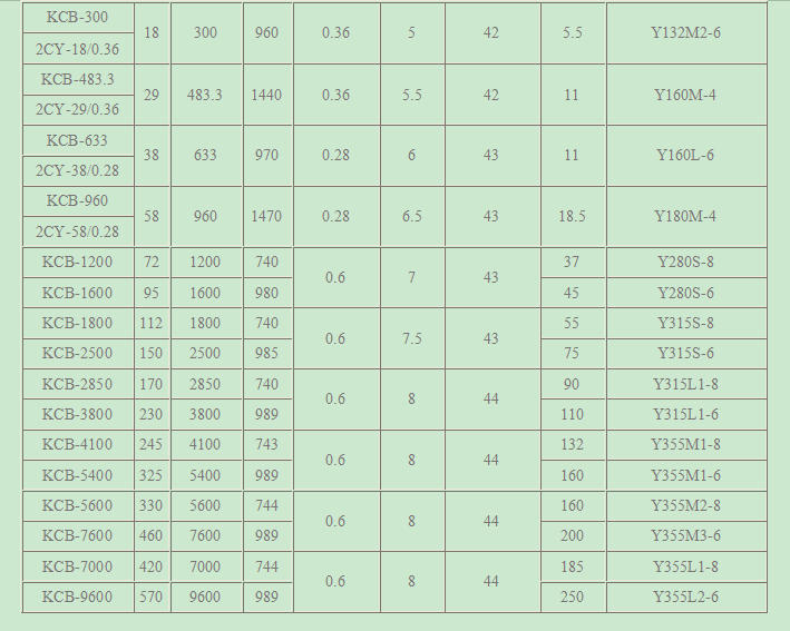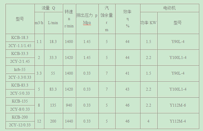 KCB系列齿轮泵性能参数表