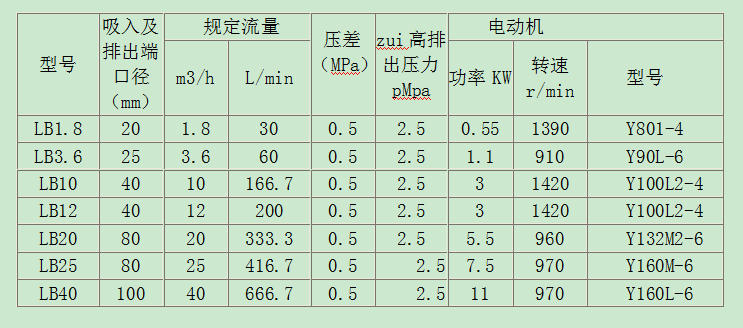 LB系列冷冻机齿轮泵性能参数及配套电机。