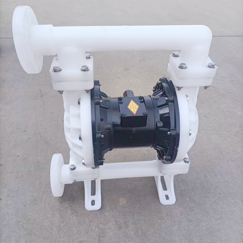 在泵的两个对称工作腔中,各装有一块有弹性的隔膜,联杆将两块隔膜结成一体,压缩空气从泵的进气接头进入配气阀后,推动两个工作腔内的隔膜,驱使联杆联接的两块隔膜同步运动。与此同时,另一工作腔内的气体则从其隔膜的背后排出泵外;一旦到达行程终点,配气机构则自动地将压缩空气引入另一工作腔,推动隔膜朝相反方向运动,这样就形成了两个隔膜的同步往复运动。每个工作腔中又设置有两个单向球阀,隔膜的往复运动,造成工作腔内容积的改变,迫使两个单向球阀交替地开启和关闭,从而将液体连续地吸入和排出。