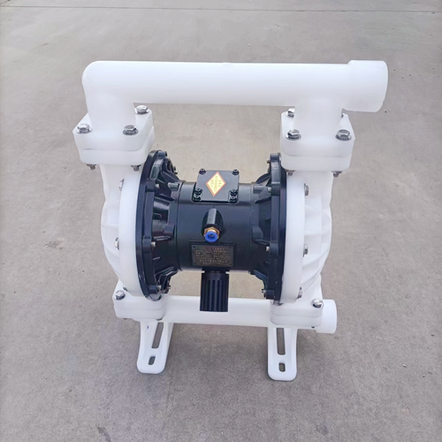 在泵的两个对称工作腔中,各装有一块有弹性的隔膜,联杆将两块隔膜结成一体,压缩空气从泵的进气接头进入配气阀后,推动两个工作腔内的隔膜,驱使联杆联接的两块隔膜同步运动。与此同时,另一工作腔内的气体则从其隔膜的背后排出泵外;一旦到达行程终点,配气机构则自动地将压缩空气引入另一工作腔,推动隔膜朝相反方向运动,这样就形成了两个隔膜的同步往复运动。每个工作腔中又设置有两个单向球阀,隔膜的往复运动,造成工作腔内容积的改变,迫使两个单向球阀交替地开启和关闭,从而将液体连续地吸入和排出。